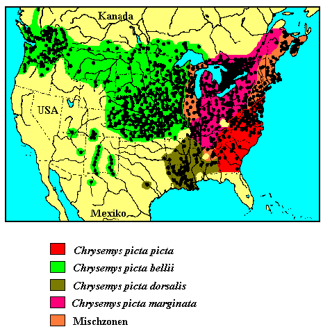 vier Unterarten C. p. picta, C. p. bellii, C. p. dorsalis und C. p. marginata; Emys,